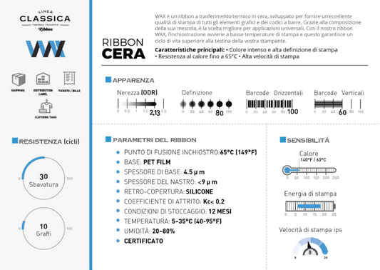 Caratteristiche: Realizzato principalmente con cera. è il più economico dei tre tipi, richiede una temperatura di stampa più bassa, produce stampe nitide ma meno resistenti. Ideale per etichette in carta non patinata, è ideale per etichette temporanee (spedizioni, inventario, logistica interna), pu essere più sensibile degli altri a graffi, umidità e calore. Ha un costo più basso e la miglio resa per le stampe su carta opaca